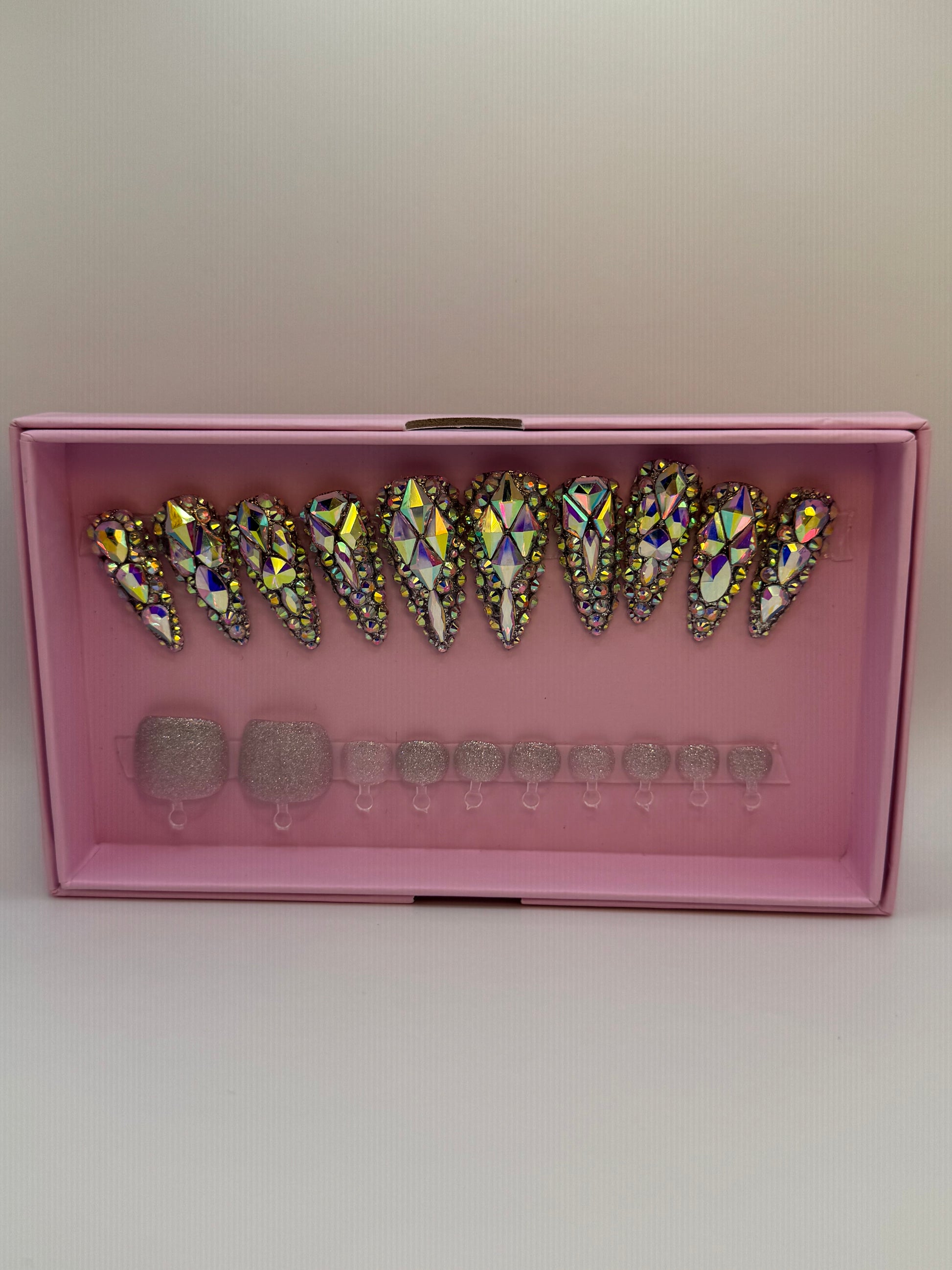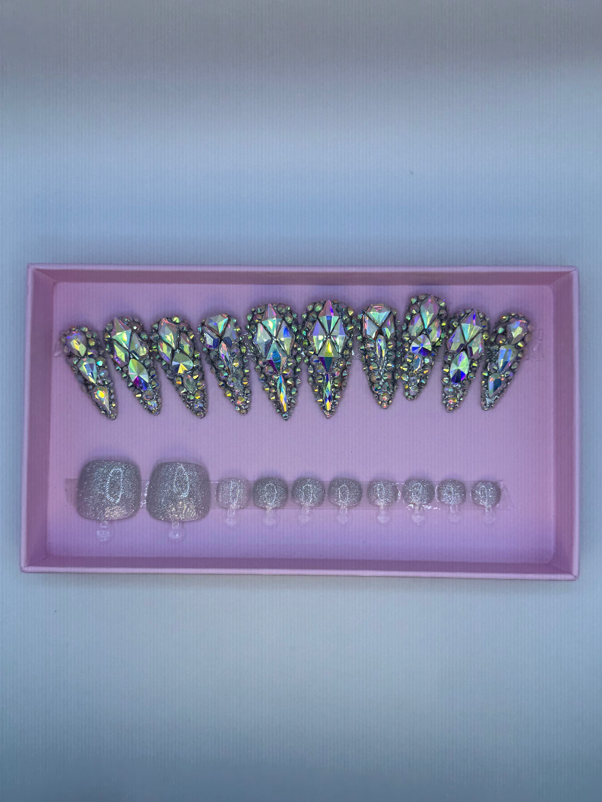 Crystal Venom is where danger meets luxurious glamour. This fierce stiletto nail set is drenched in high-shine holographic crystals that catch every angle of light, reflecting a hypnotic rainbow shimmer. Each nail is sharply sculpted for a bold, venomous silhouette and bordered in micro-rhinestones for maximum drama. Designed for the femme fatale who commands attention with every move, Crystal Venom is the ultimate power statement—bold, brilliant, and unapologetically extra. Also comes with a set of luxury press on toe nails
