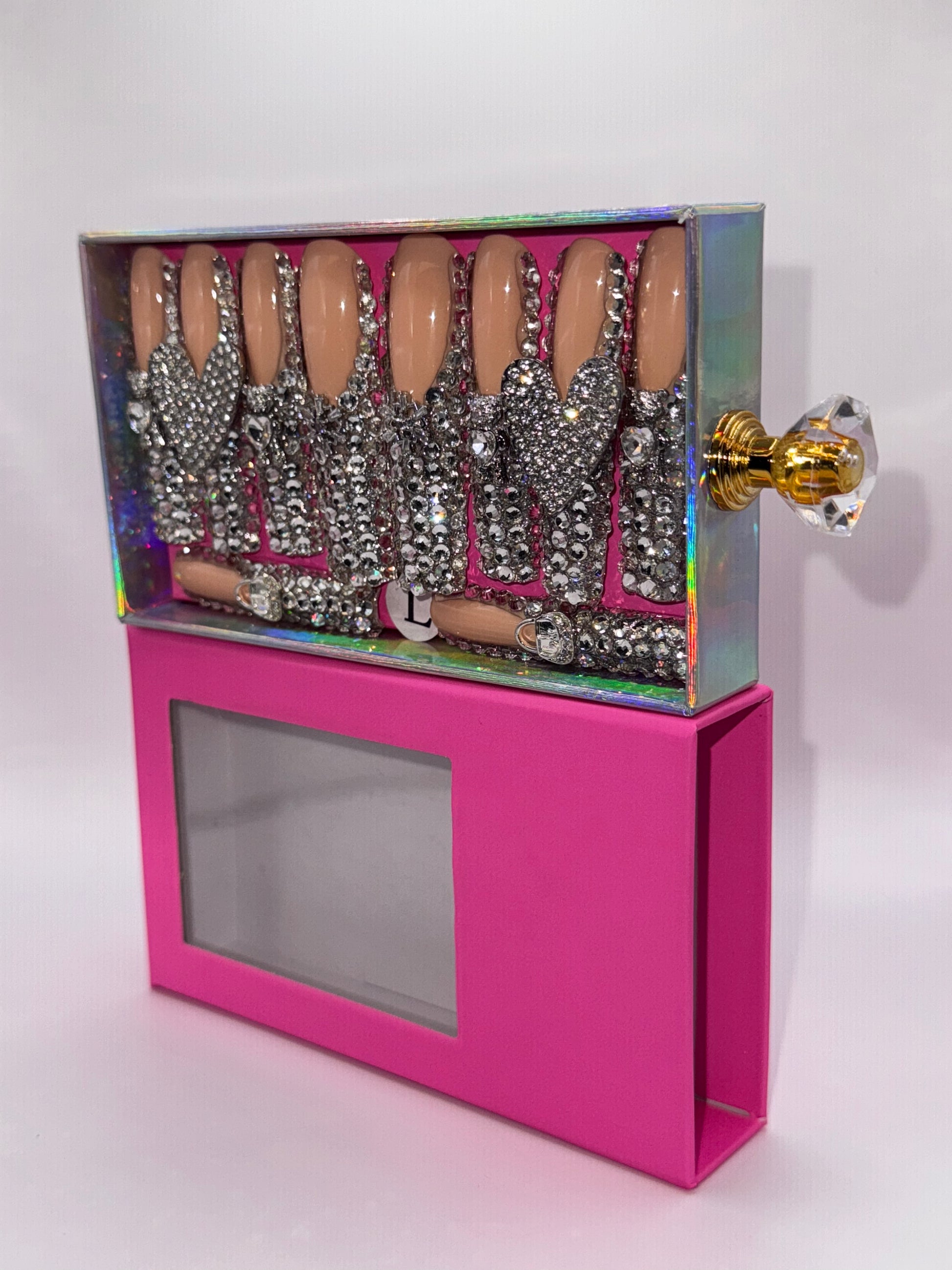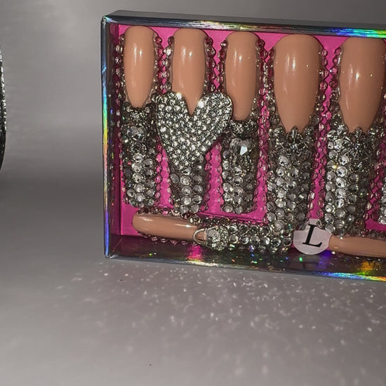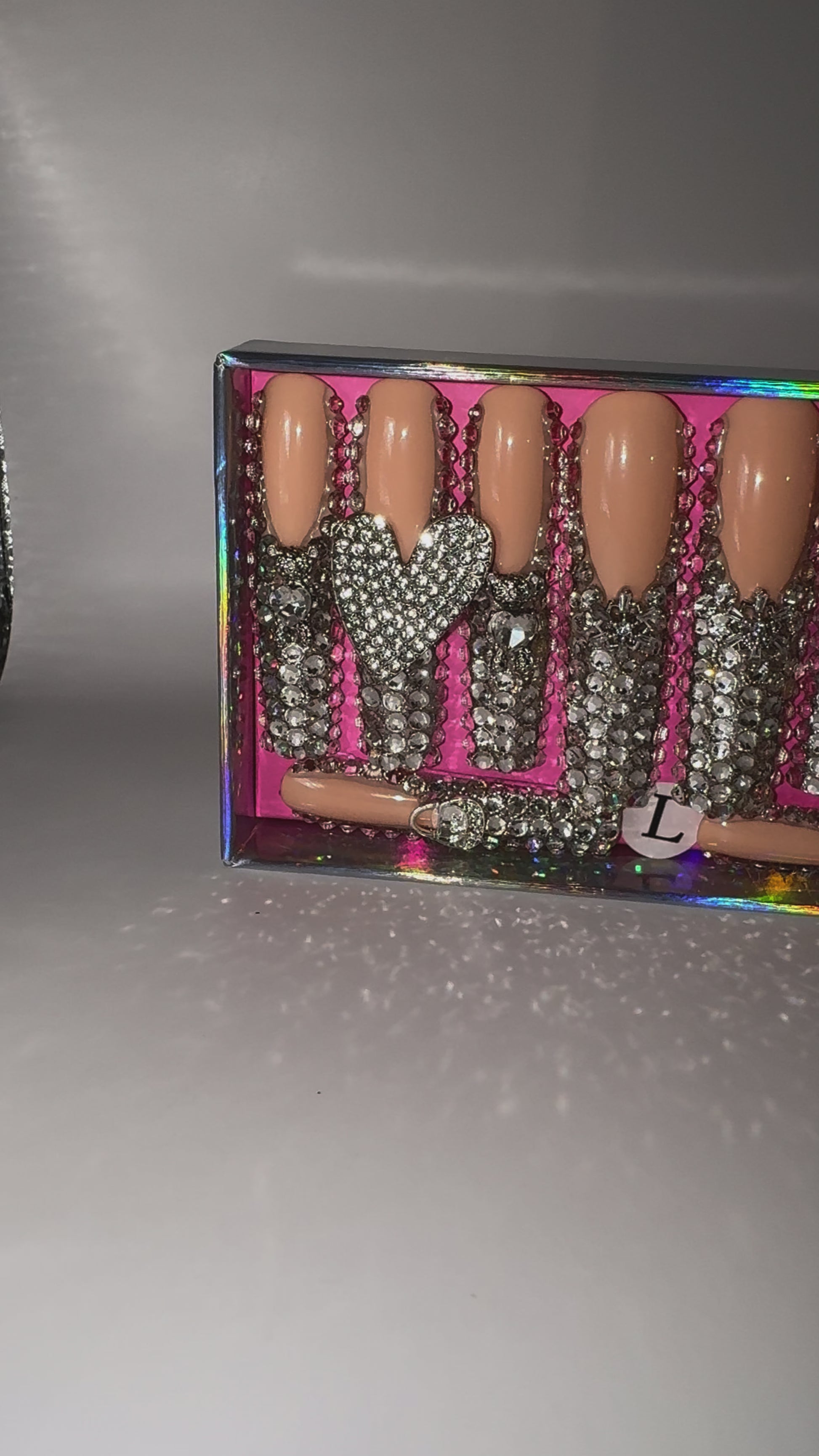 Fall in love with every sparkle in our luxurious Diamond Hearts press on nail set. Designed for the true glam lover, this set features a rich nude base completely encrusted in dazzling crystals, giving a luxurious diamond-dusted effect from every angle. Two statement nails are adorned with elegant heart charms for a soft romantic touch. Whether it’s a night out or a special occasion, Diamond Hearts brings irresistible sparkle and feminine power to your fingertips!