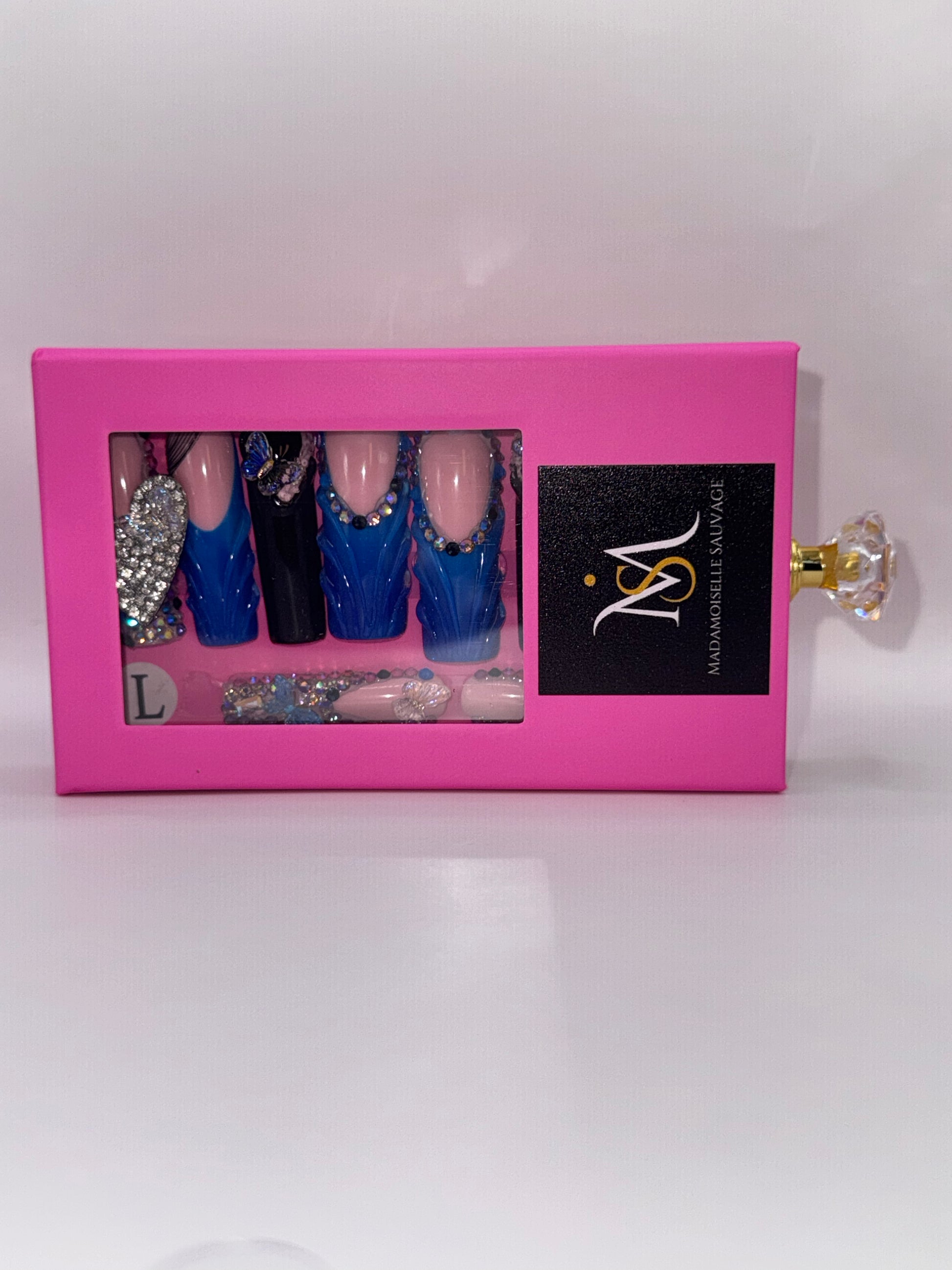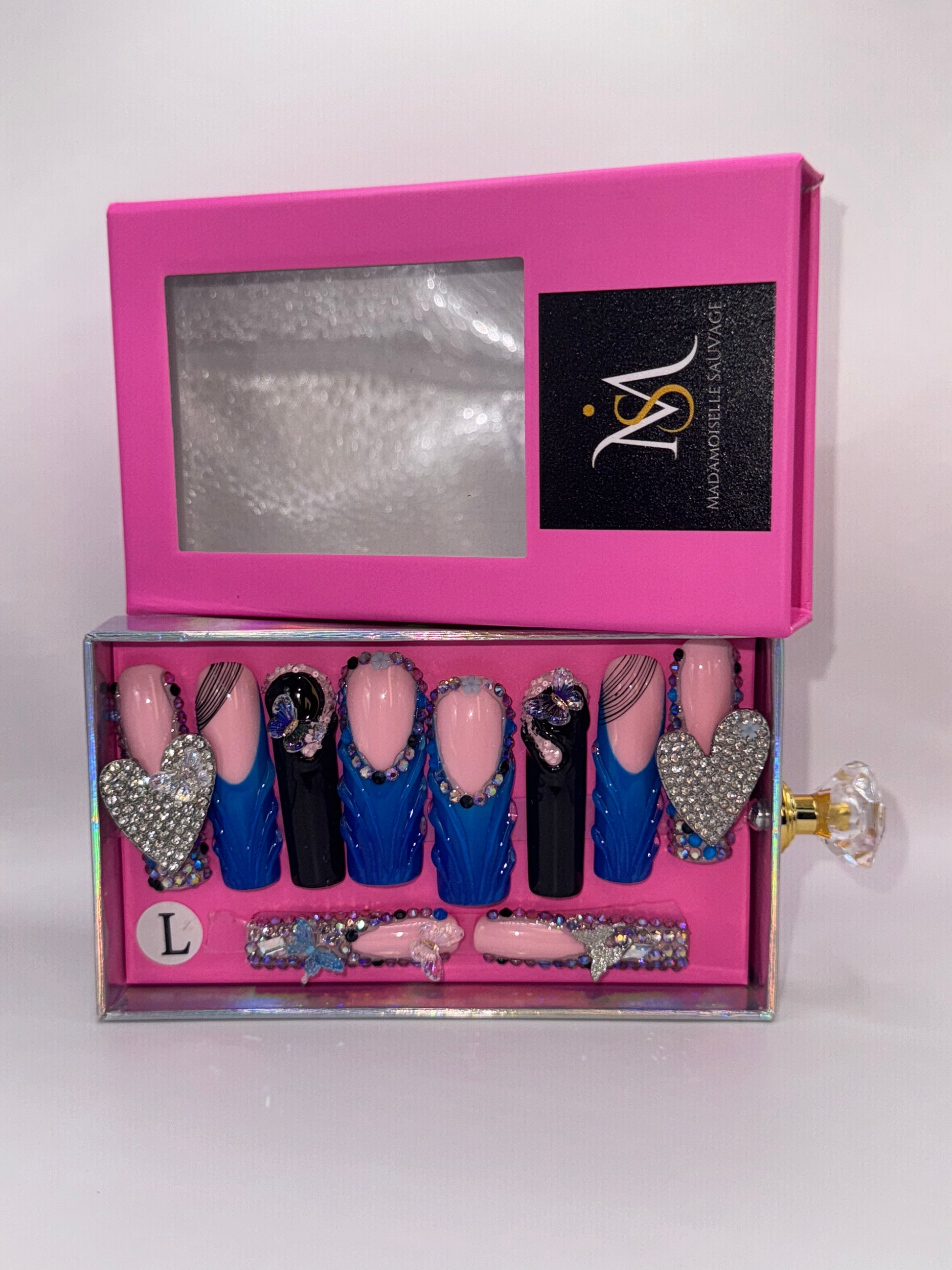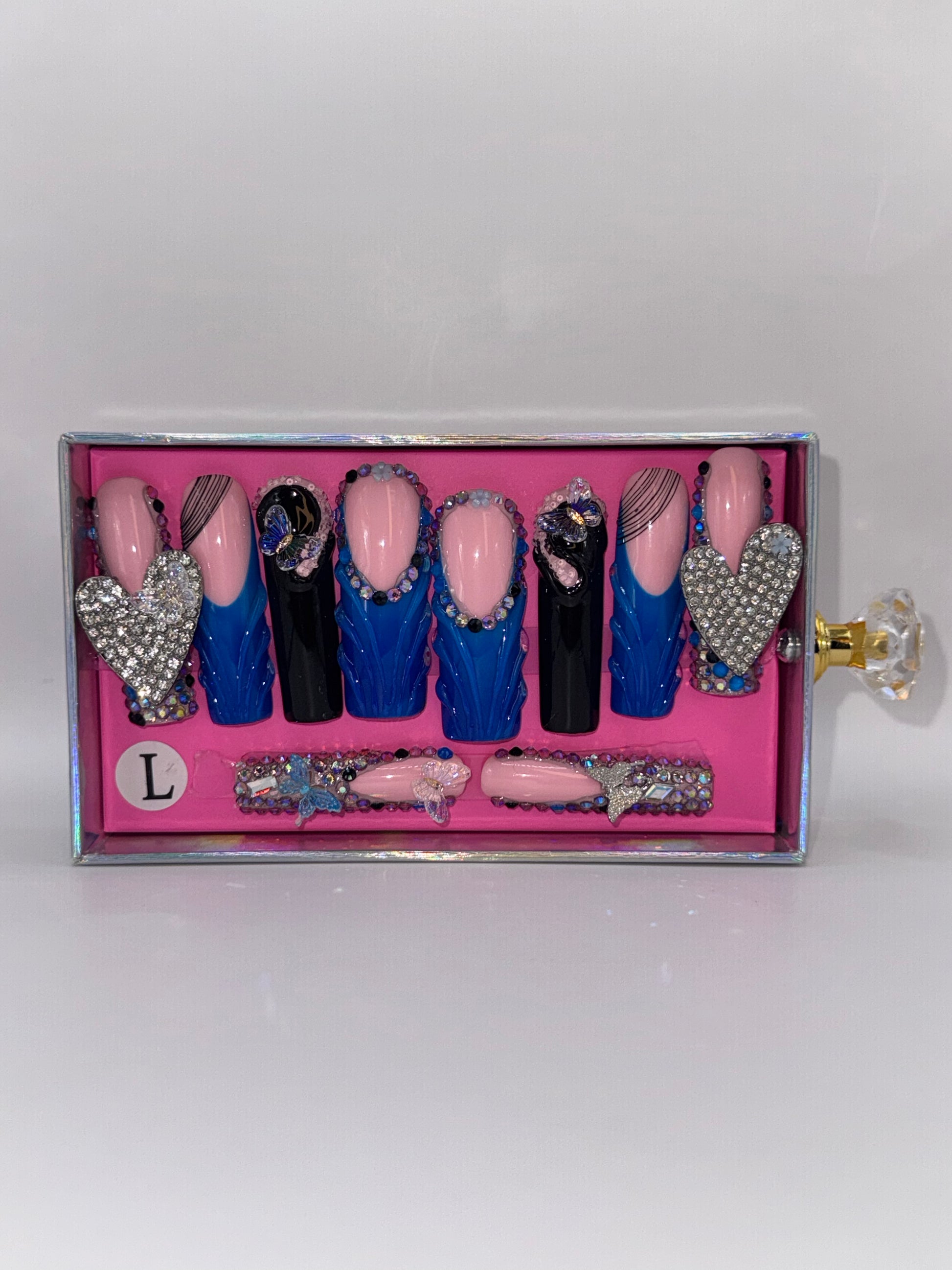 Midnight Muse is a luxurious dreamscape of bold contrasts and feminine flair. This press-on nail set features a dramatic blend of deep sapphire blue sculpted accents, glossy black shine, and soft blush pink. Embellished with 3D butterflies, silver gems, and oversized heart charms, each nail tells a story of edgy elegance and daring romance. Inspired by many creatives, it’s the perfect look for the muse who owns the night and lights up every room she walks into.