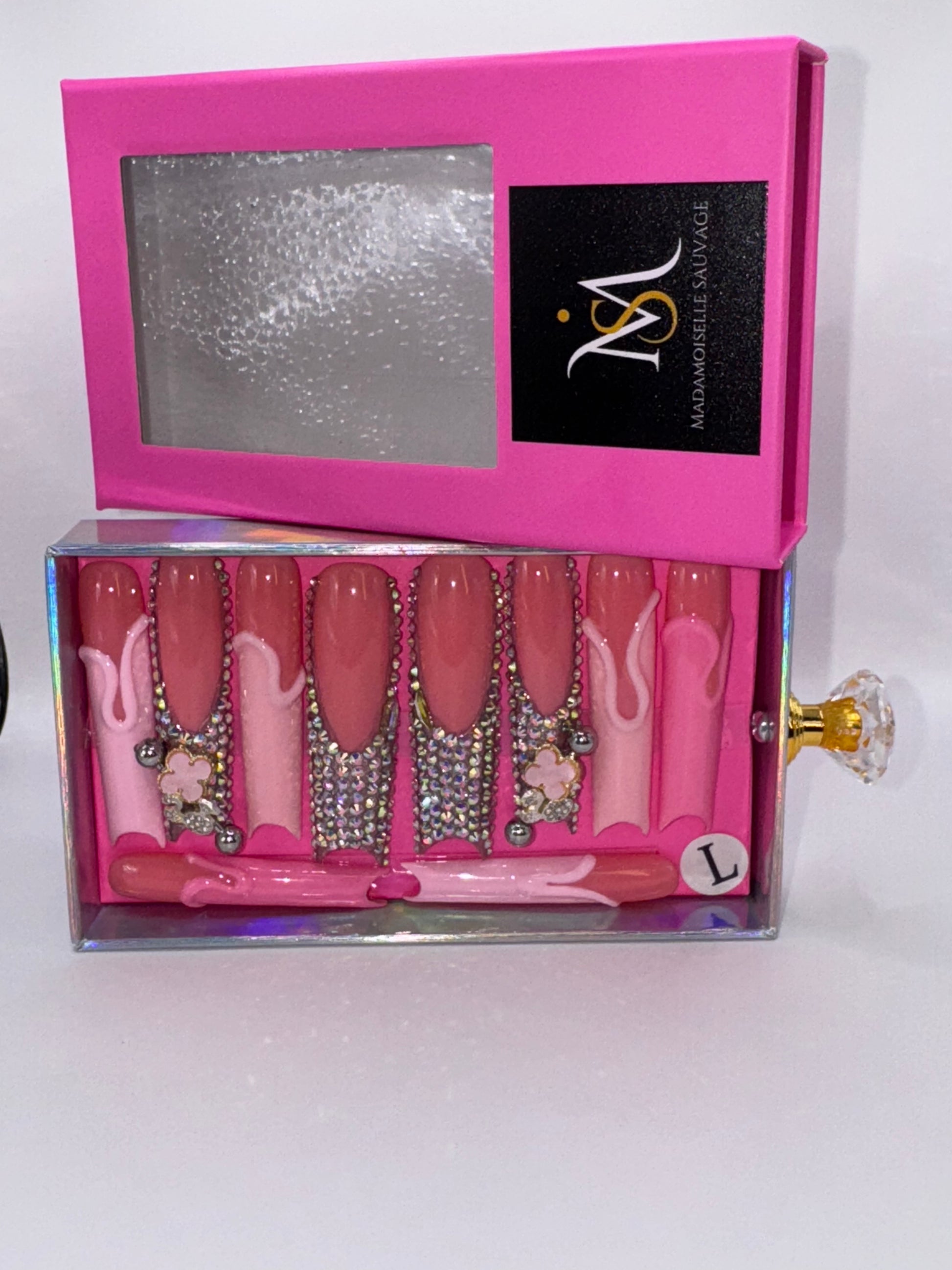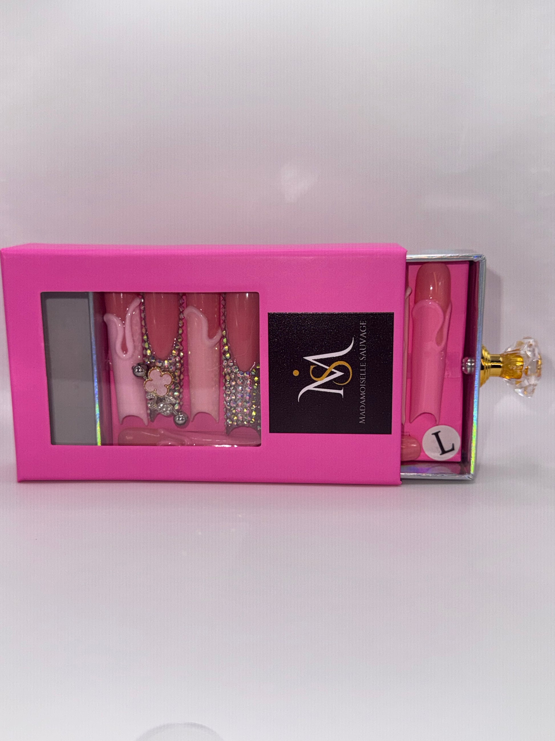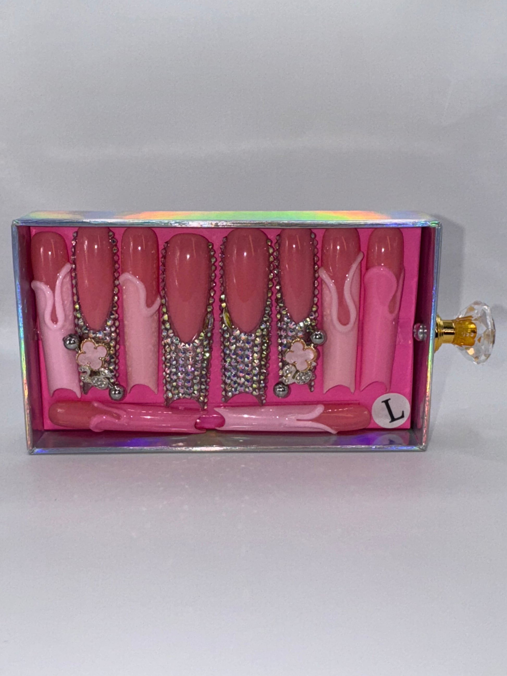 Indulge in ultra-feminine glam with our luxurious Cotton Candy Frenchie press on nail set. Featuring a playful blend of soft pink hues, glossy nude bases, and cascading crystals, this set is elevated with hand-placed crystal nail gems, luxe 3D floral charms, and glossy drip accents. Perfect for the babe who loves a sweet statement with a lavish twist. Comes in a high-quality drawer box with a crystal handle for the ultimate unboxing experience.