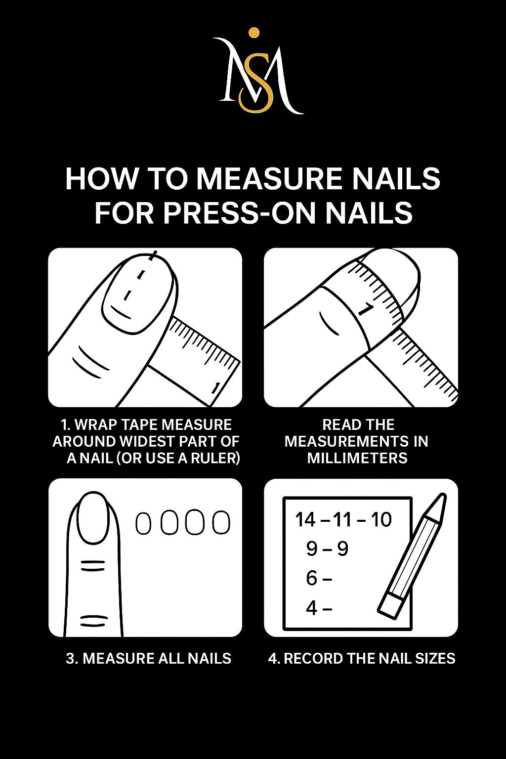 Sizing chart and measuring instructions are shown after the nail photos—please refer to them to ensure the right fit before purchasing