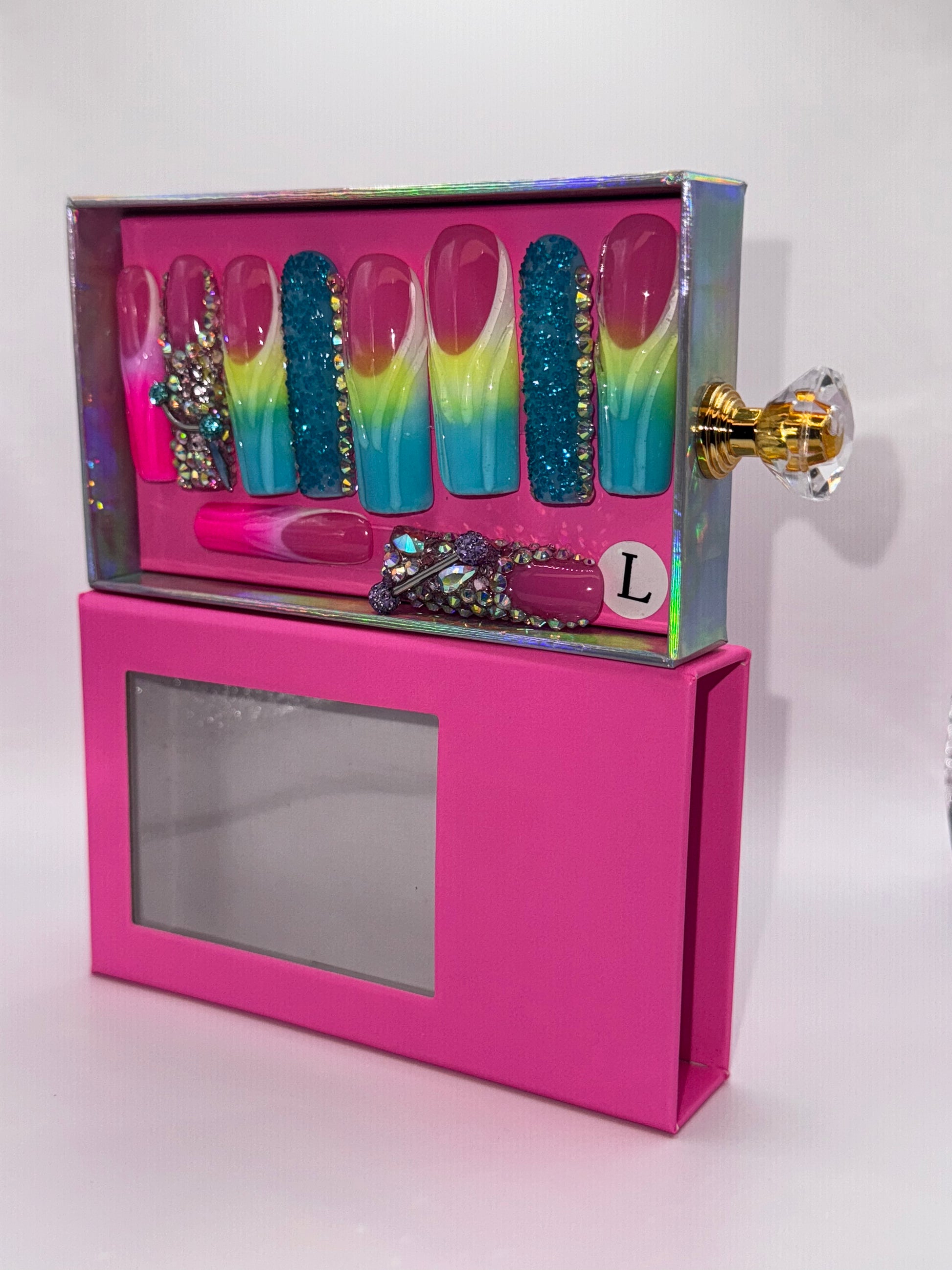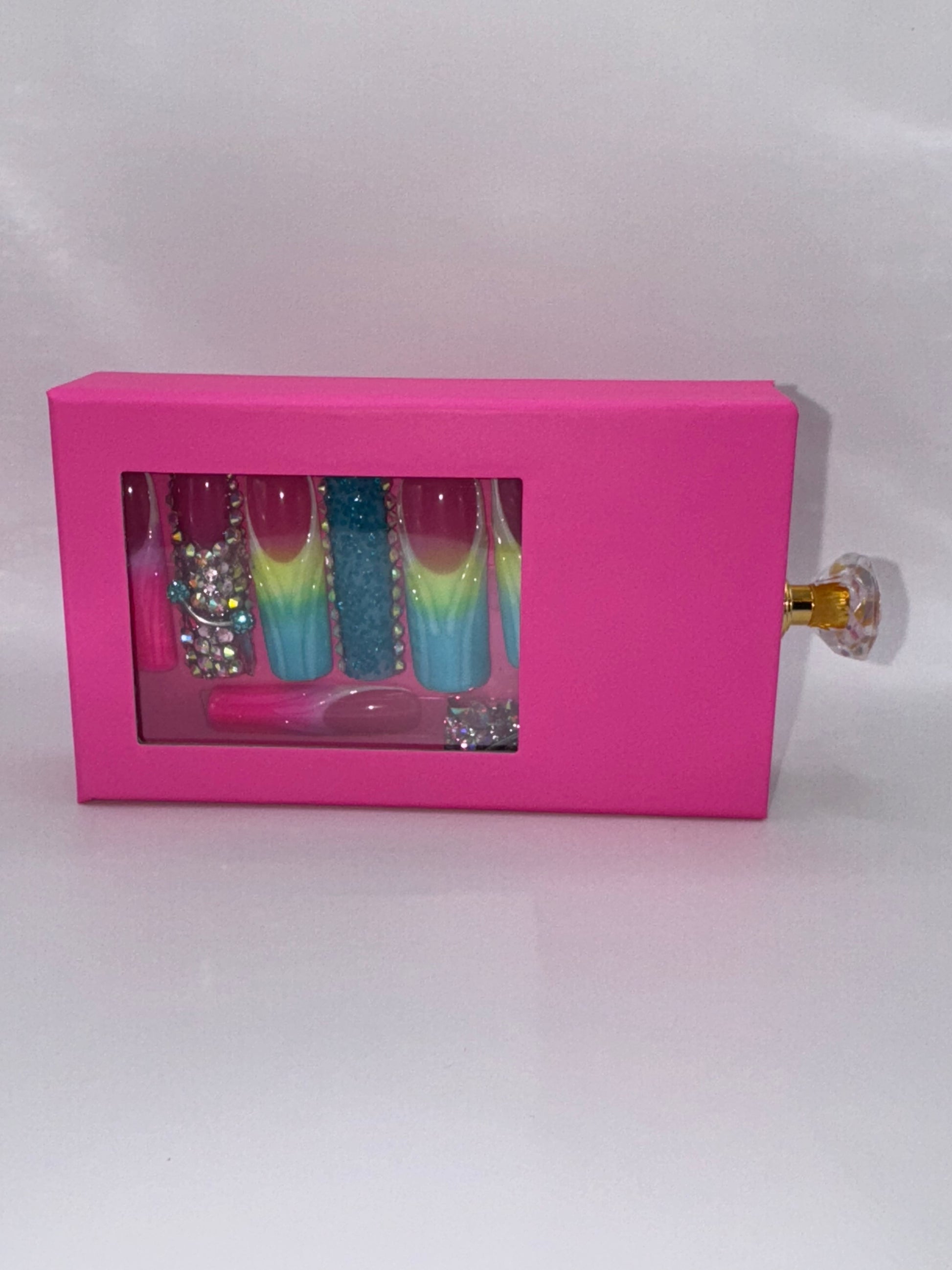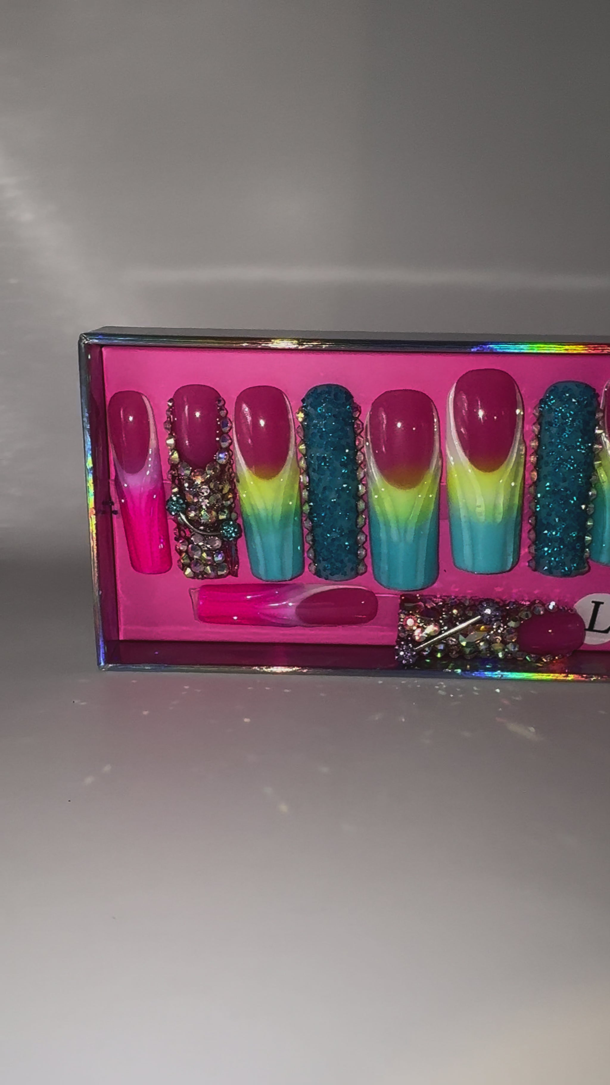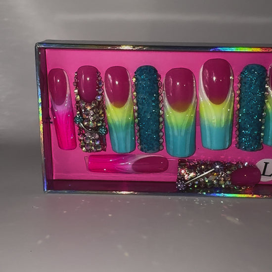 Bring the heat with Tropicana—a luxurious, tropical-inspired press-on nail set bursting with vibrant summer energy. Featuring a stunning ombré blend of fuchsia, sunshine yellow, and turquoise, each nail is designed to evoke the essence of an island sunset. Luxe pink accent nails are drenched in dazzling gems and textured aqua crystals, adding high-glam sparkle to every gesture. Tropicana is the ultimate statement for beach days, poolside parties, or anytime you want to radiate bold, luxurious beauty.